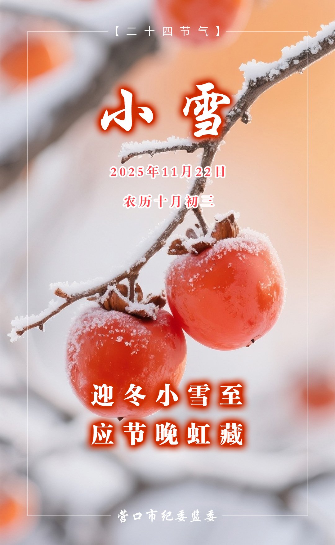 迎冬小雪至,应节晚虹藏。党员干部应从小雪的意境中领悟立身之本,在风雪兼程的人生路上,守得住清白、扛得起责任,用两袖清风书写无愧于时代、无愧于人民的廉洁答卷。